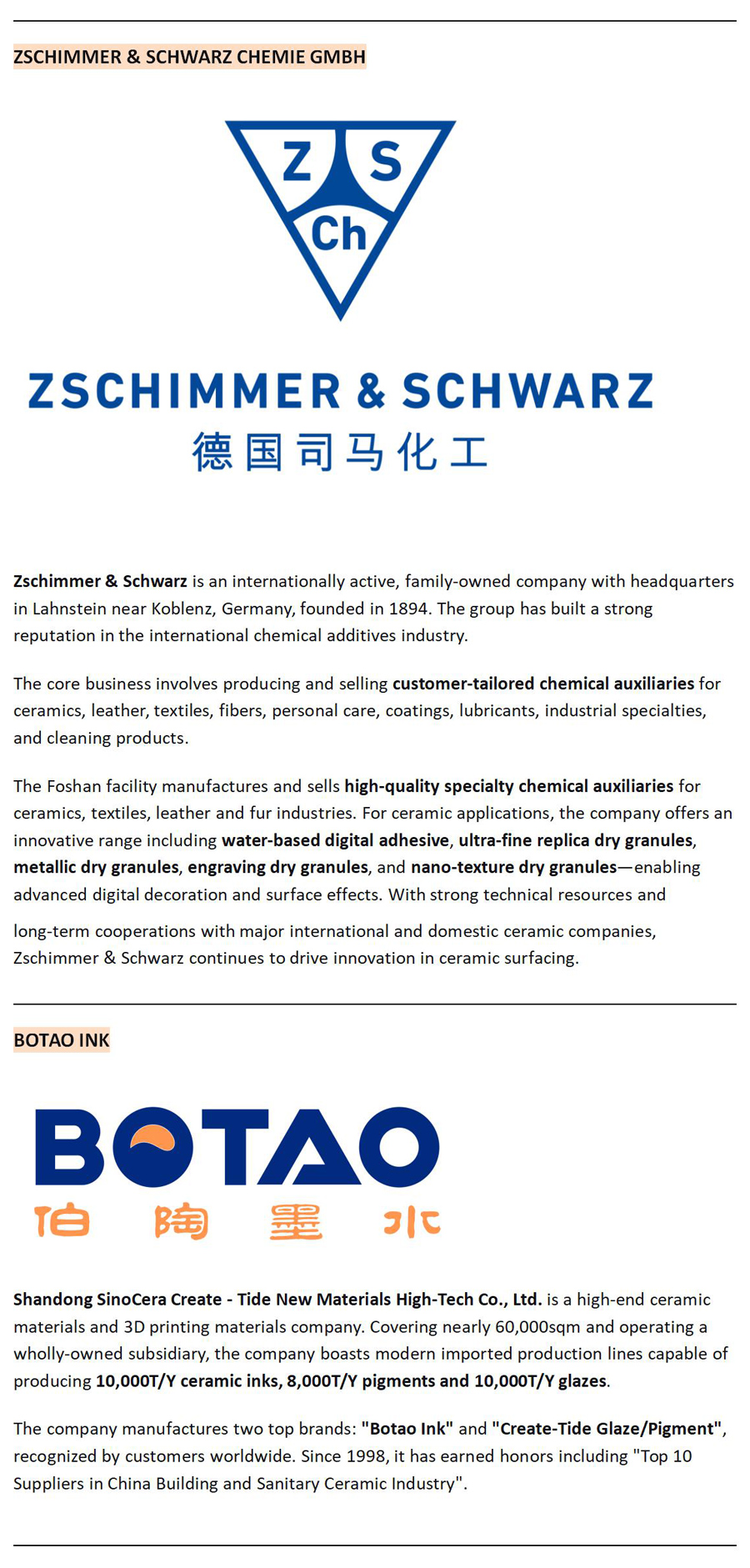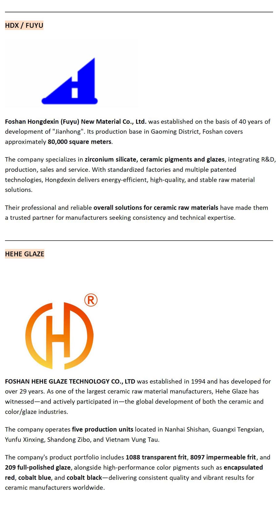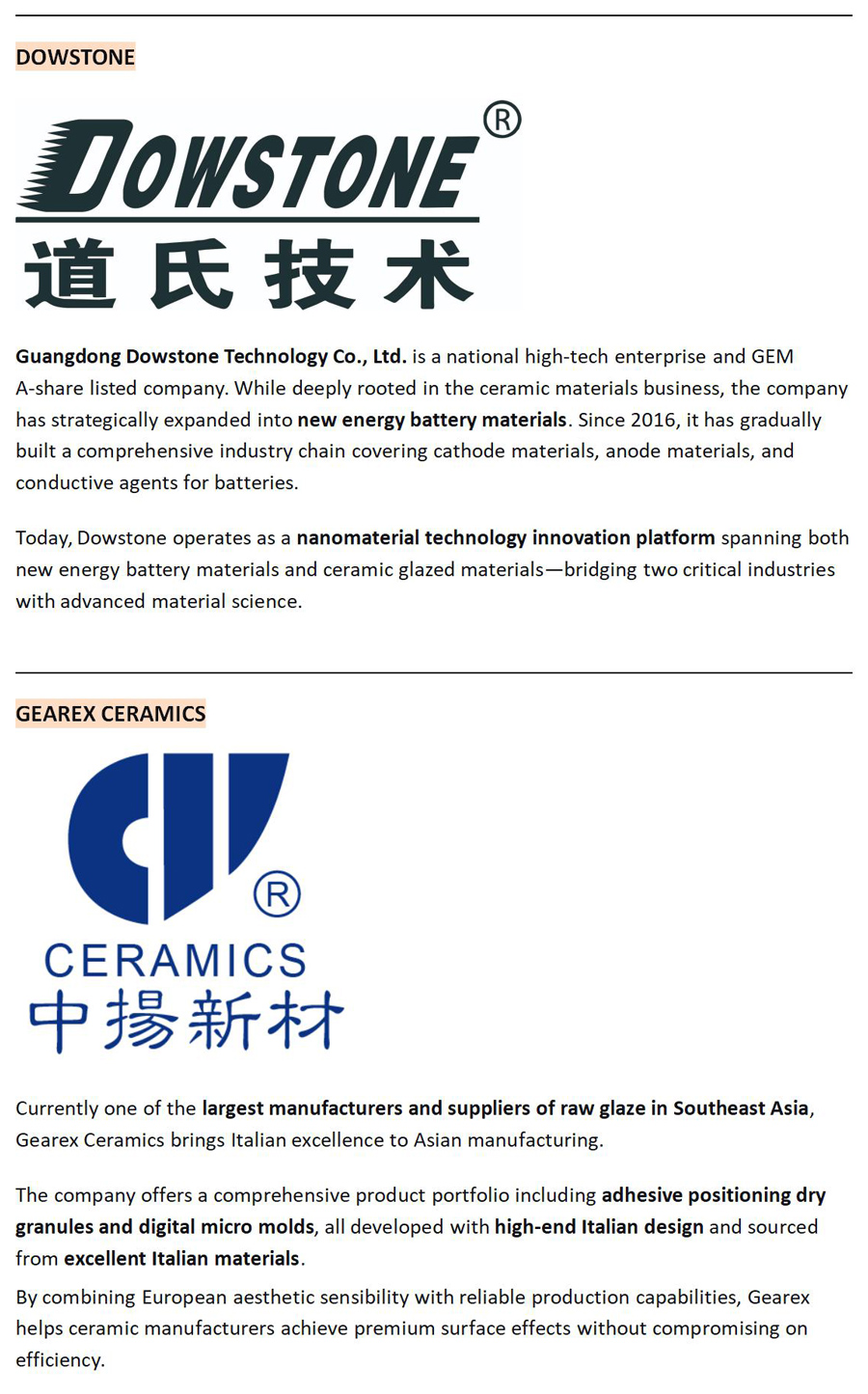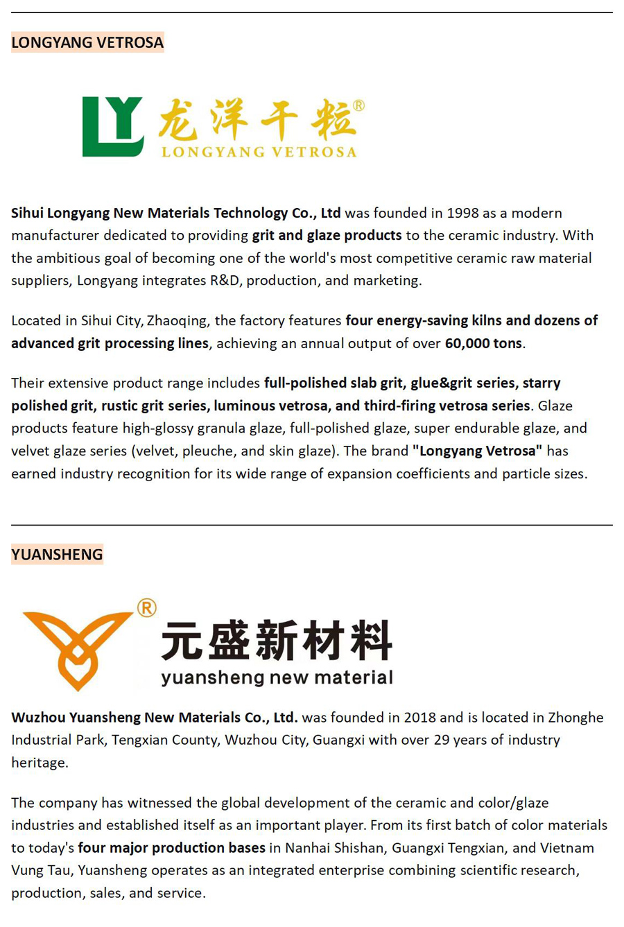 The colors that captivate. The textures that compel. The finishes that define excellence—they all begin with one thing: material science. From encapsulated reds that never fade to nano-texture granules that transform surfaces, innovation in ceramics starts with the chemistry of color and glaze. This year, these material masters gather in Hall 5, the dedicated Color & Glaze Pavilion at 2026 Foshan Uniceramics Expo. Meet the experts behind the surfaces.